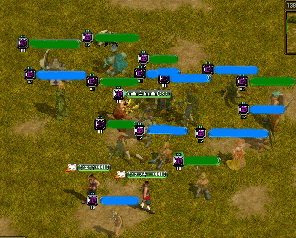 見たままのWIZさん1、BISさん2、戦士さん1、シフ武道さん2、プリリトル?さん2、ネクロ悪魔さん1、剣士さん2、アチャさん1、ランサさん1の2PTで確かTOP400~410だったような気がします・・・