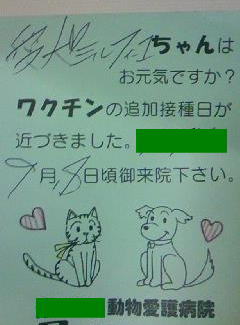 うちの猫「みるふぃーゆ」のみるちゃんの年に1度のワクチン接種の知らせのハガキが、いつもお世話になっている動物病院から来ていたのですが「犬」になってますΣ(゚д゚lll)
